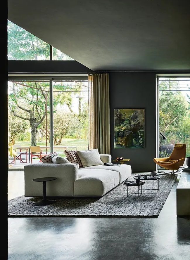 The Dambo sofa family expands with Dambodue, a new version with a particularly generous shape and richly upholstered back and armrests. The seat is direct and rests on the floor, emphasised at the base by a bronzed nickel painted profile that gives it a particularly strong character.