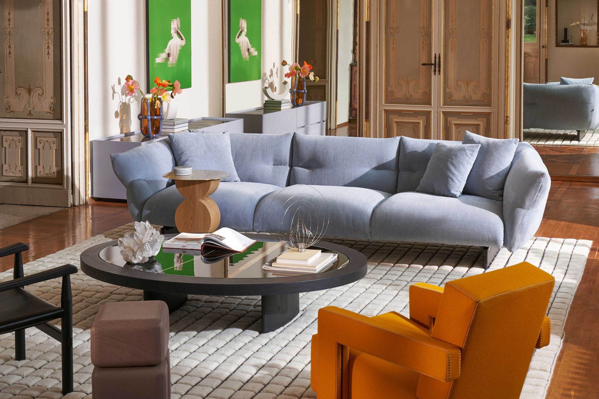 Designed by Patricia Urquiola, Mon-Cloud is an extremely elegant, versatile sofa, studied to rethink upholstered furniture design with an eye to circularity. The wooden structure lifts the upholstered parts off the floor, lending the entire sofa the lightness of a cloud.