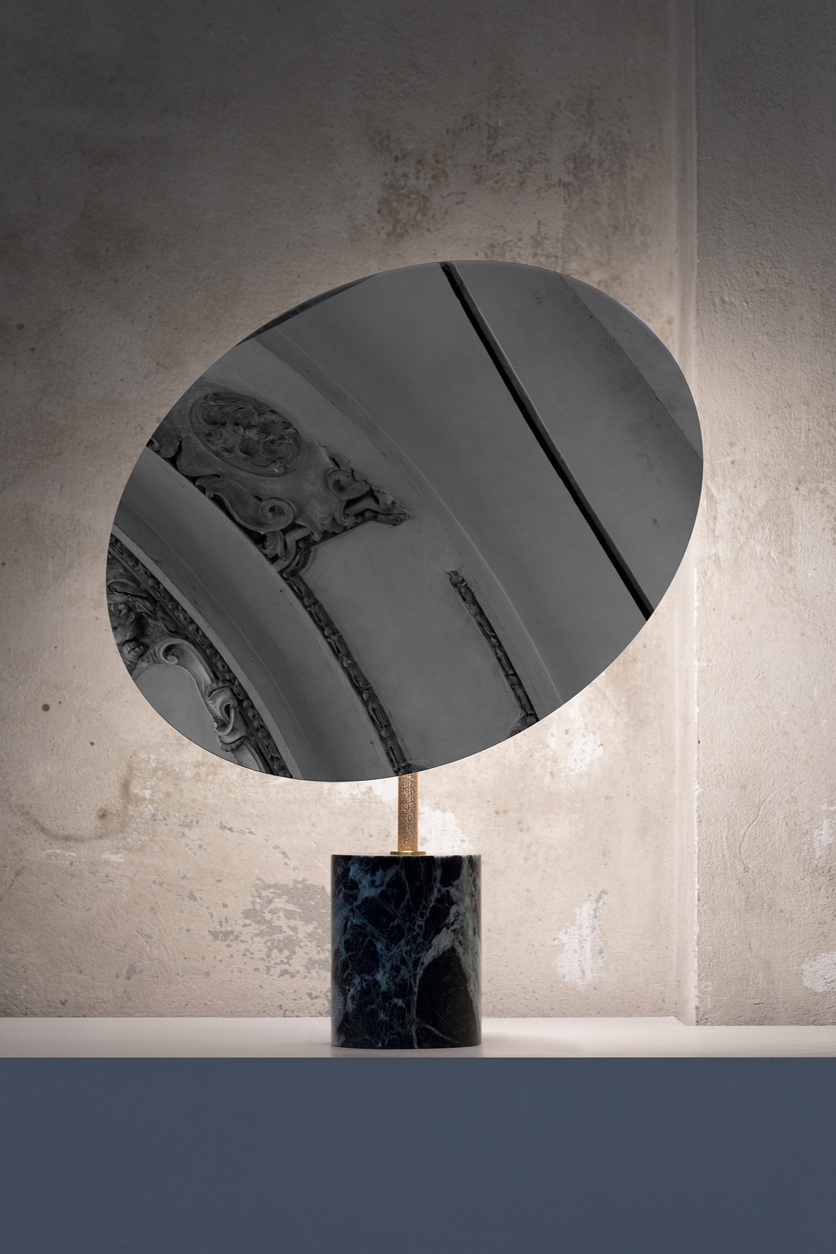 Available finishes: A circular mirror with Travertine or Green Alps marble base.