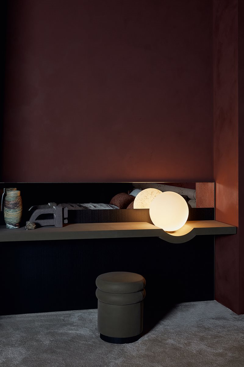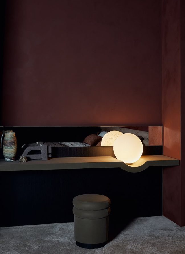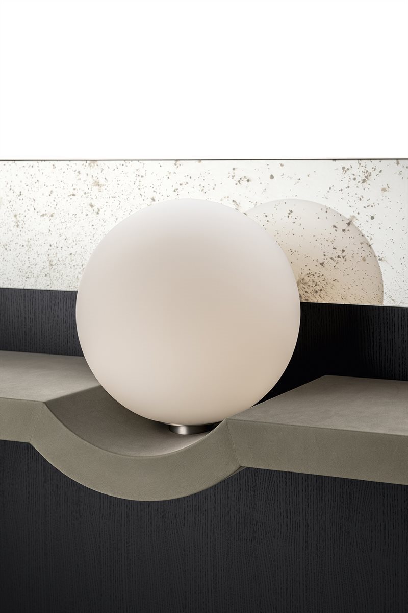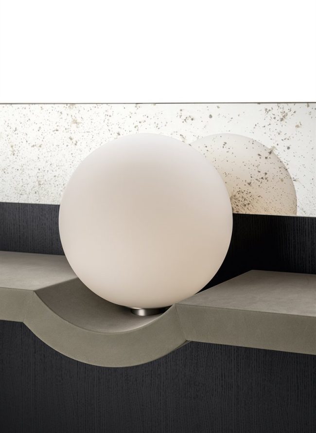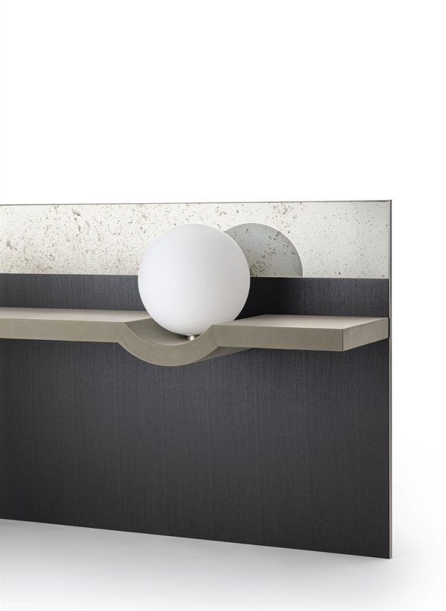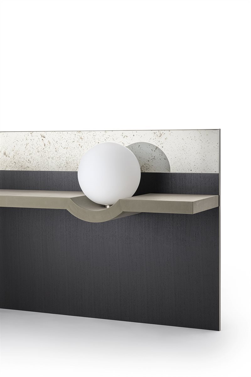 Wall-mounted boiserie panel in black, tobacco, or Pure white open-pore finish with “Antique 1” mirror. Upper wooden shelf covered in fard leather. Includes 35 cm opaline glass lamp (E27 bulb supplied), touch-activated beneath shelf. Satin nickel profiles and sphere support. Right or left version available. Option without lamp also offered.
