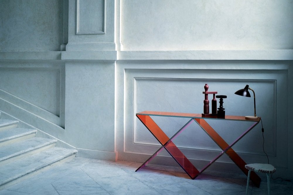 Console realized in transparent pink and orange colored glass. The base, composed of two Xs in tempered and laminated glass, with special chamfering and gluing, is embellished by metal polished chrome elements.
