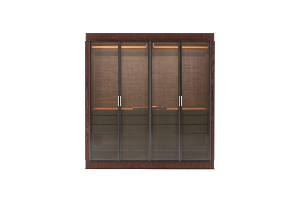 The Eracle storage unit for the sleeping area features rigorous, well-balanced proportions. Also proposed in a double-sided version, it is characterised by volumes, doors and backs with transparent glass (lined internally with high-tech fabric) and metallic profiles. The use of precious materials ensures minimal, sophisticated aesthetics: the wooden frame comes in all the essences available in the catalogue, while the interior is lined with melamine facedcolonial leather and is fitted with a chest of drawers.