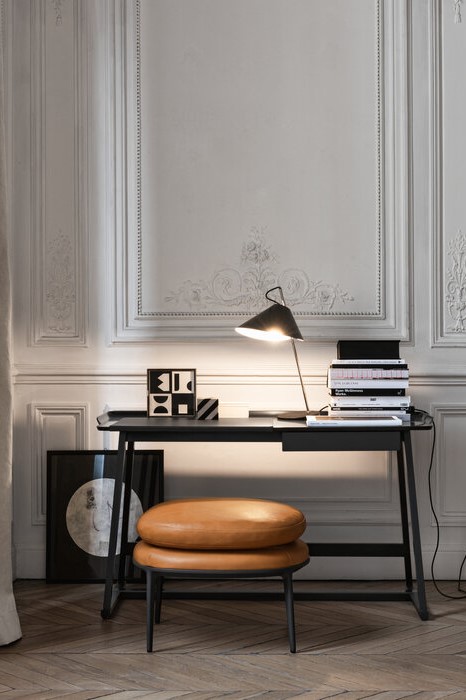 The Recipio ‘14 writing desk with drawer is characterised by a tripod frame in solid wood and by a Baydur® structural polyurethane foam top marked by soft lines and a tray-shaped design. Particularly sophisticated is the shellac effect finish in a variety of colours.