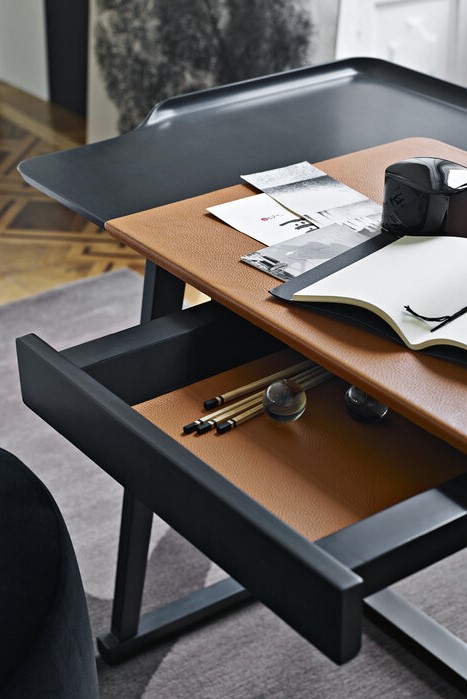 Available finishes: Top steel sheet covered in leather / Support frame in solid wood or lacquered finish