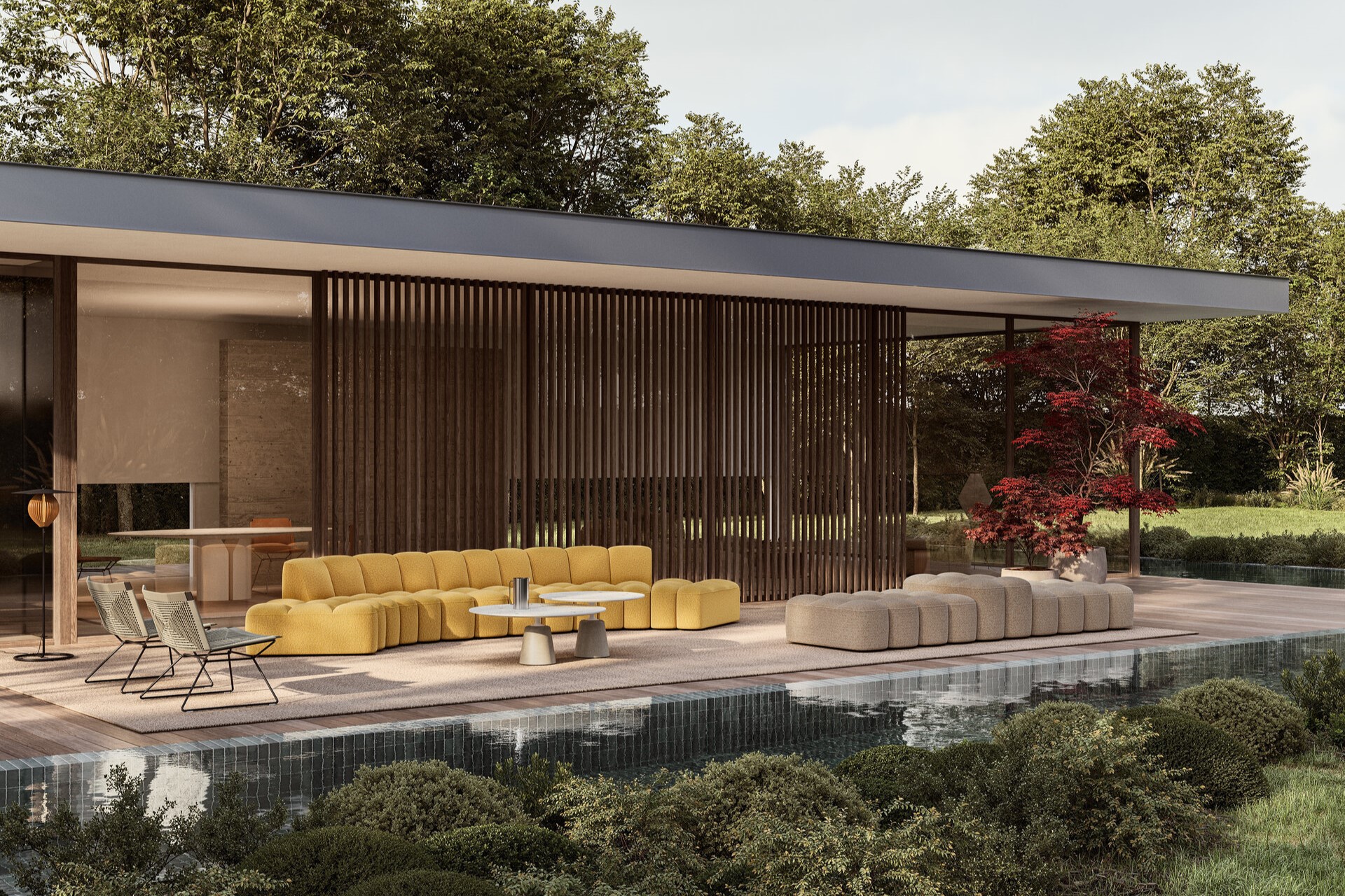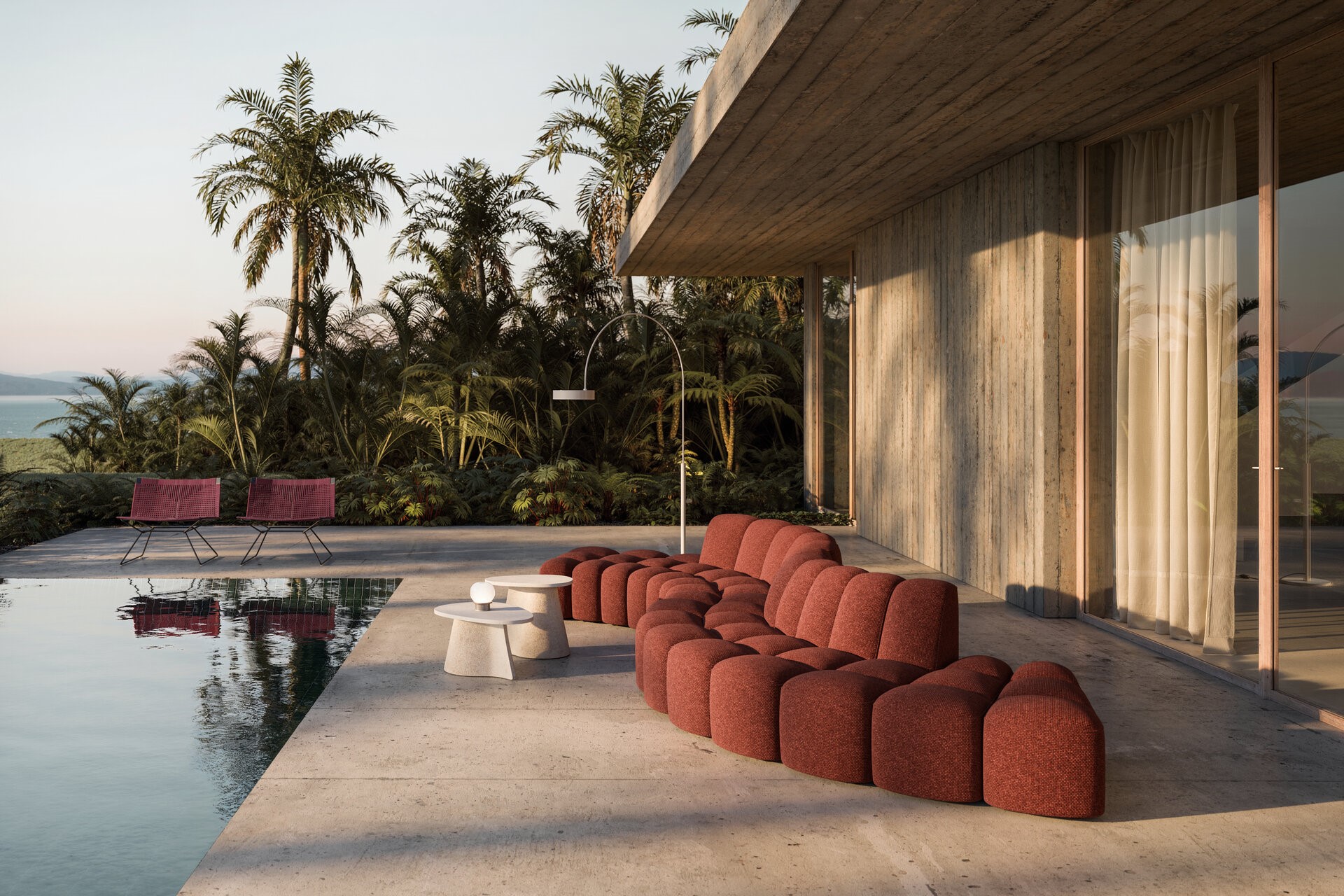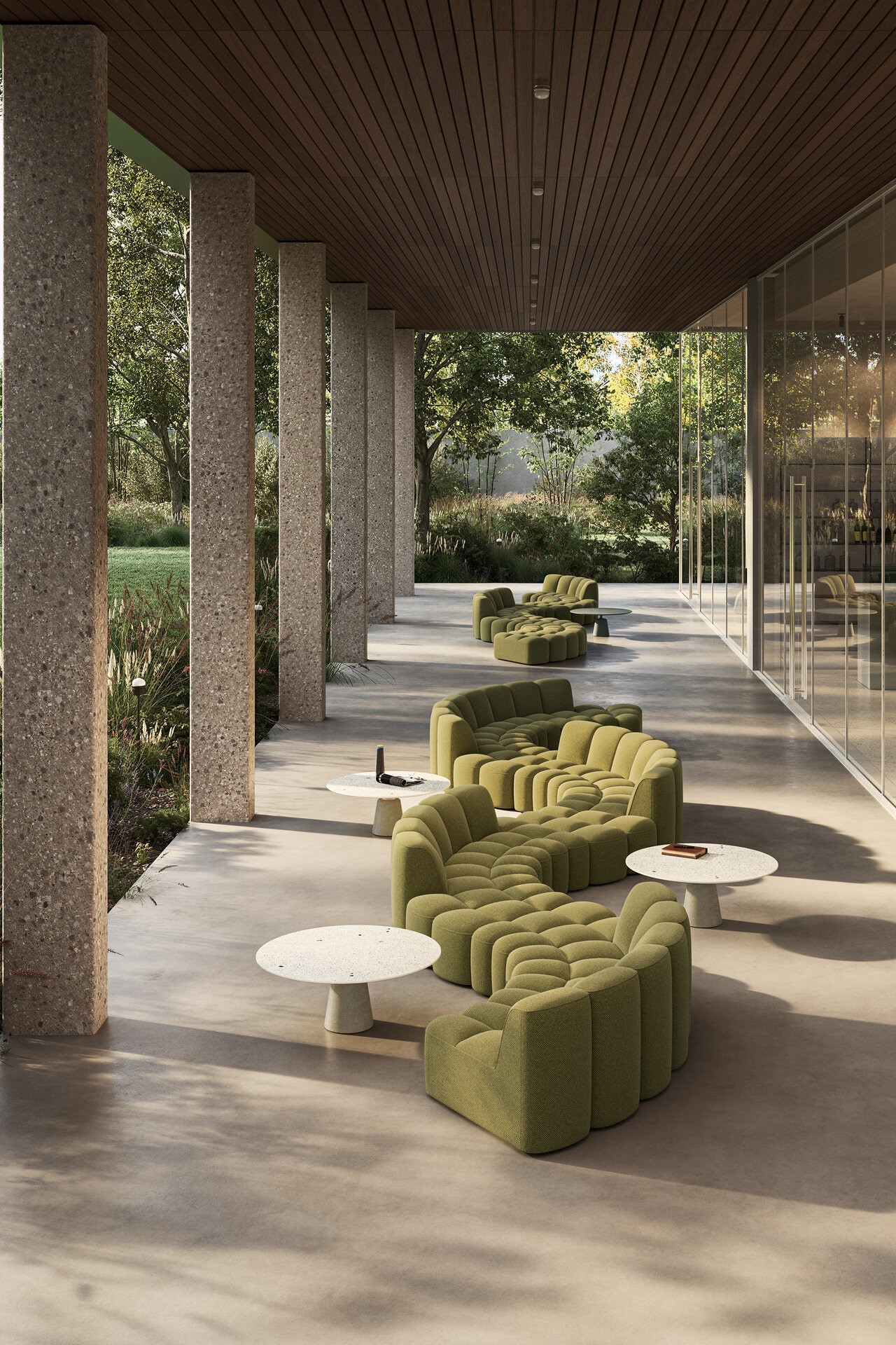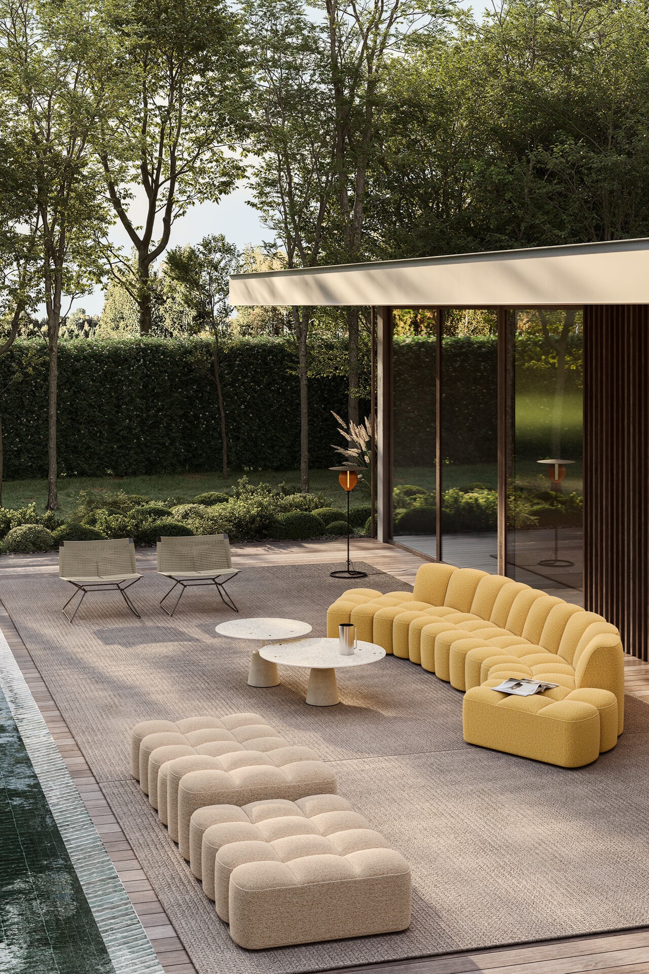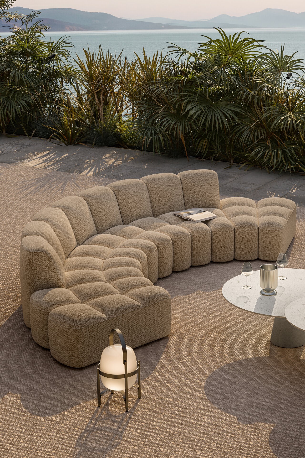 Array Outdoor extends design outdoors, furnishing terraces, gardens, and lounges with solutions for residential, contract, and public spaces. Straight and curved modules, plus poufs, combine freely to form adaptable, sociable layouts. Fully upholstered in diverse fabrics and colours, each element creates soft, continuous forms that harmonise naturally with surrounding environments.