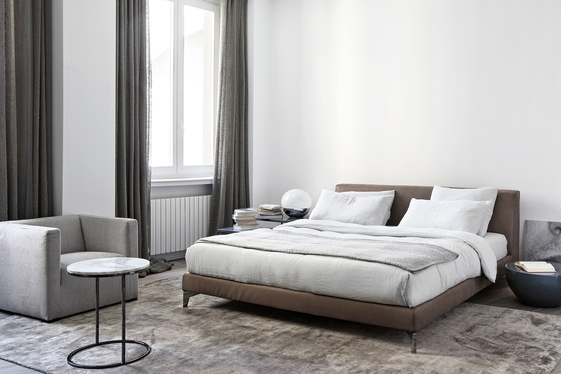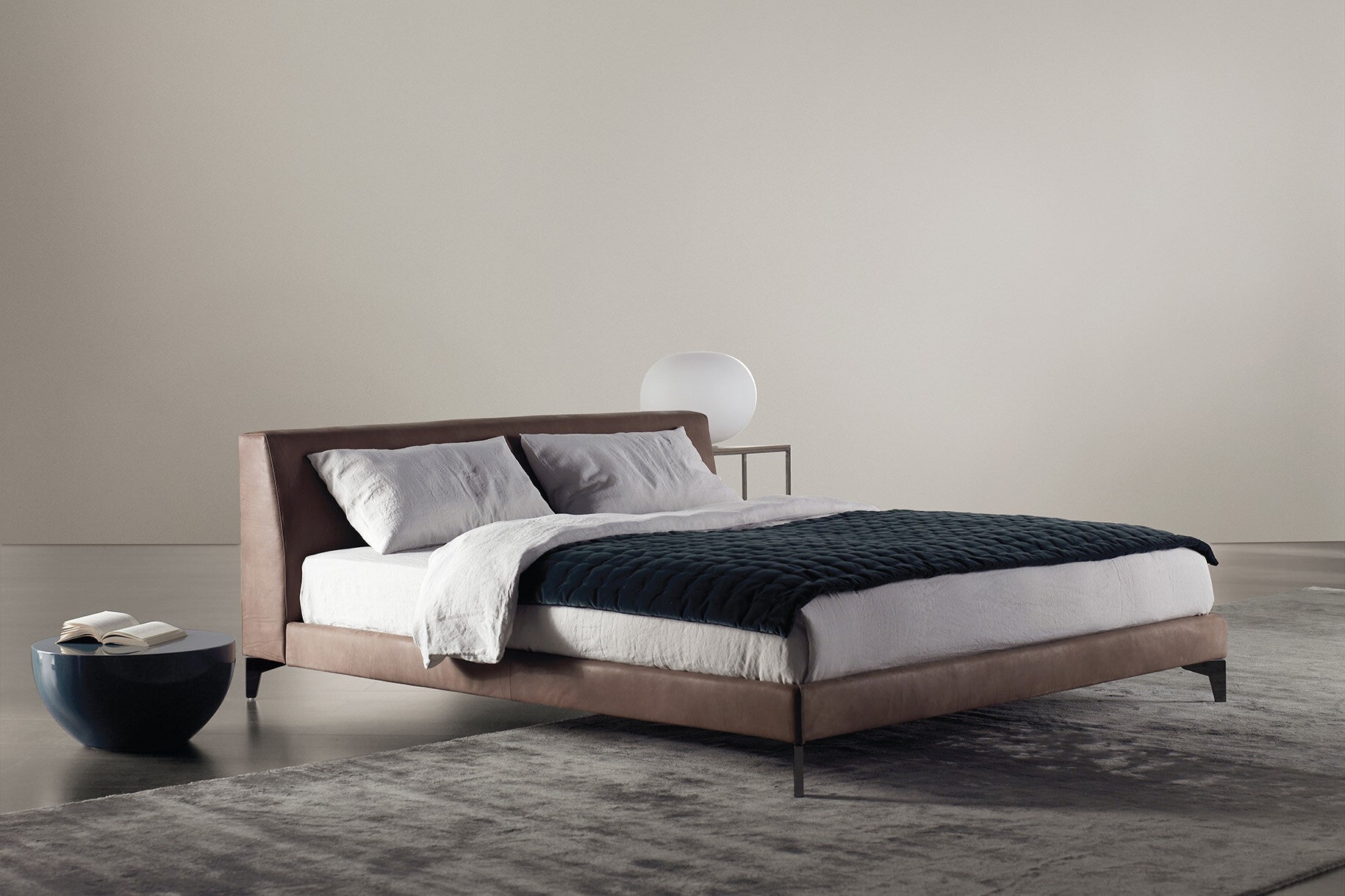 Upholstered textile bed, whose severe and refined design is tempered and simplified by a detail catching immediately the eye: light metal feet which suspend the bed.