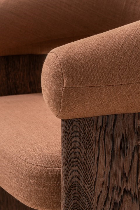 Available finishes: Upholstery in fabric or leather with oak or walnut structure