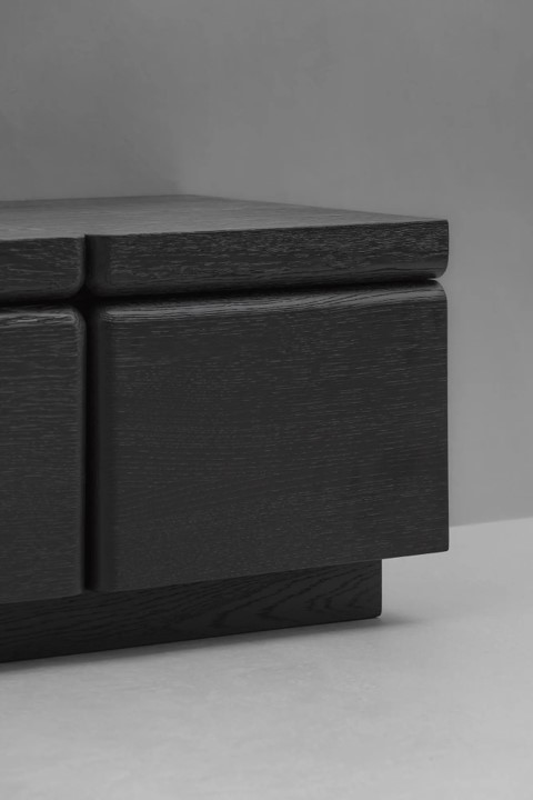 A low sideboard with a wooden top, two drop-down doors and a smaller right-turning door, providing functional storage. Available in French oak or walnut. The low profile and rectilinear form lend the piece a bold, almost architectural quality, where the balance of lines and natural materials creates a strong, grounded presence.