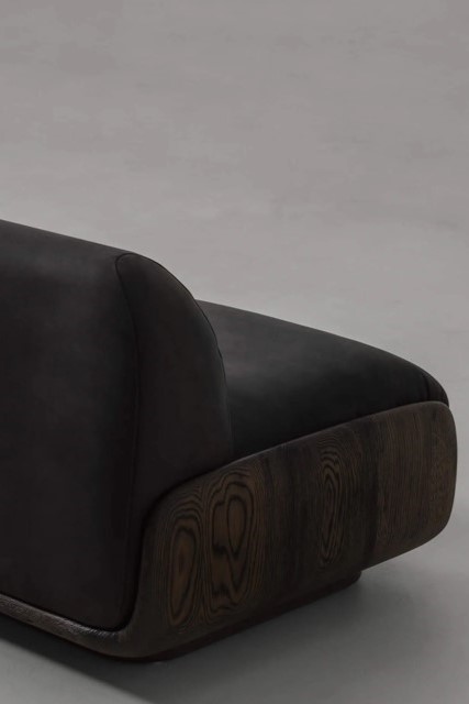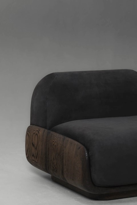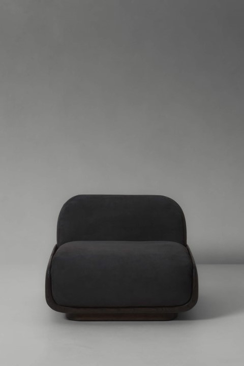 A low-lying lounge chair with a wooden frame and soft, rounded upholstered cushions. Available in French oak, and with your preferred covering from our collection of fabrics and leathers. The wooden structure, carved to resemble a scoop, cradles the plush pillows to elevate them from the ground, exuding a sense of heightened comfort.